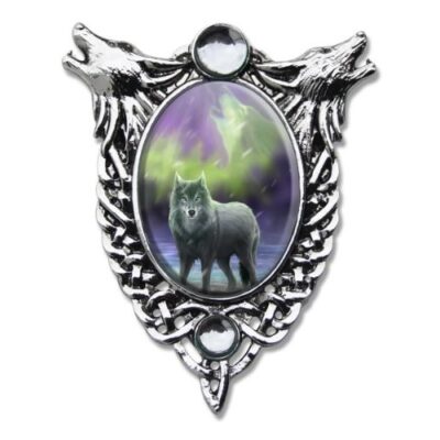 De cabochon is bezet met twee huilende wolven met Keltische knoopdetails en met twee heldere ronde imitatiekristallen in de setting.