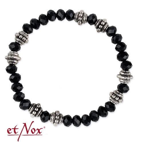 Fraaie armband van het merk etNox, met zwarte facetgeslepen glaskralen en 8 zilverkleurige bewerkte metalen kralen. De armband is ca. 17 cm. lang en rekbaar door middel van elastiek. De metalen kralen zijn gemaakt van een zink-alumninium legering.