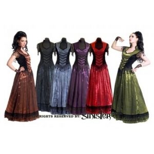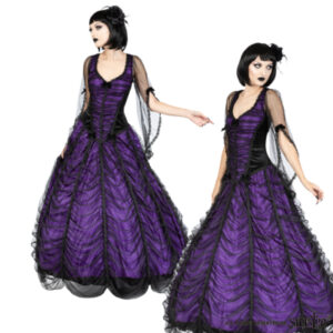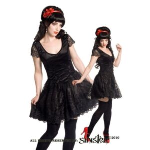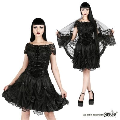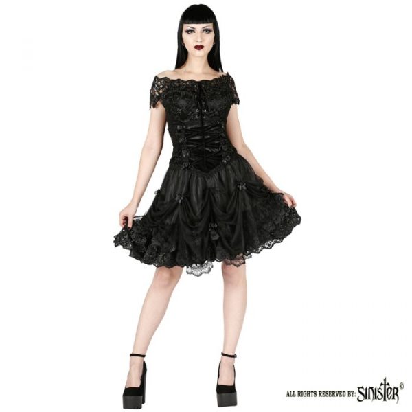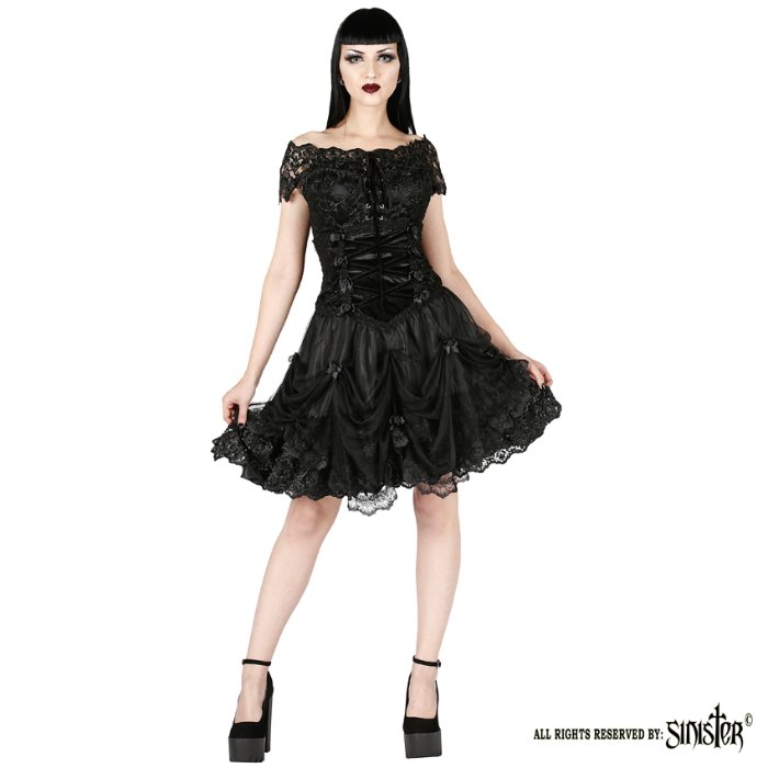 Off-shoulder Lolita minijurk van Sinister, model 991 in zwart. De jurk heeft een geborduurde kanten bateau-halslijn. Middenvoor op de buste zit een fluwelen lint dat door metalen oogjes wordt geregen. De zijpanelen van de taille zijn bedekt met geborduurd kant dat is afgezet met brokaat. Een fluwelen zigzag applicatie siert het middenfront van de taille en is versierd met zwarte satijnen strikken en rozen. De satijnen rok heeft een brede ruche van geborduurd kant en de bovenste meshlaag van de rok is geplooid met rozen en afgezet met kant. Blinde ritssluiting op de rug.