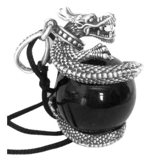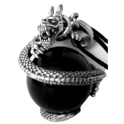 Prachtige en zware 925 Sterling zilveren hanger van een draak, die een zwarte onyxkogel “bewaakt”.