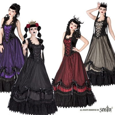 Dramatische gothic jurk van het met Sinister, model 1064. De jurk heeft een prachtige zogenaamde “diamanten” halslijn. Het accentuerende satijnen paneeltje in de taille aan de voorzijde heeft een zwarte kanten overlay en is versierd met een kruisapplicatie van zwart velours lint. Aan weerszijden is het paneeltje afgezet met Venetiaans kant en versierd met kleine zwarte satijnen roosjes op strikken.