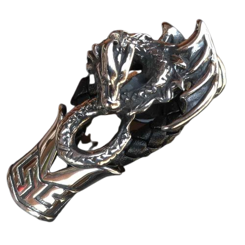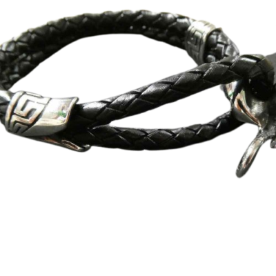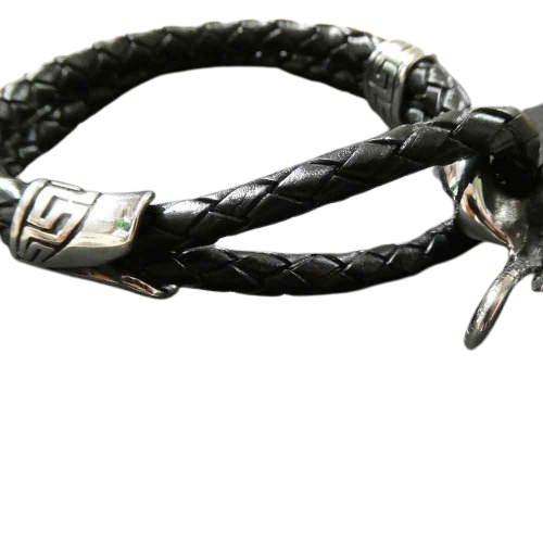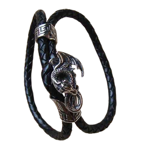 Geweldig stoere gevlochten zwart leren armband met draak in hoogwaardig roestvrij staal uitgevoerd. Sluiting door middel van schuif-lus systeem.