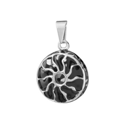 Fraaie ronde roestvrij stalen hanger met de voor- en zijkanten in zwart met zilveren belijningen. De achterzijde is geheel glad.