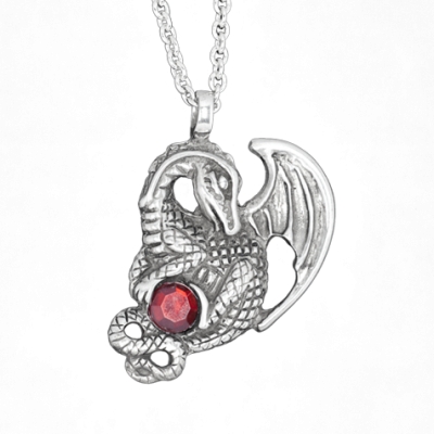 Tinnen hanger met rode glanzende steen. Afmeting van de hanger is ca. 30 x 45 mm. Deze hard tinnen hanger wordt geleverd inclusief ketting.
