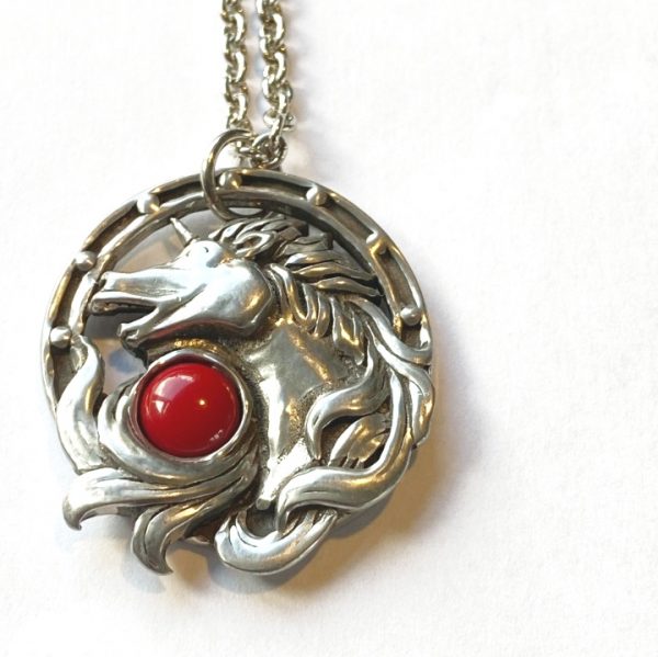 Tinnen hanger eenhoorn met een donkerrood kleurig steentje. Deze hard tinnen hanger heeft een doorsnee van ca. 30 mm. en wordt geleverd inclusief ketting.