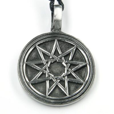 Tinnen hanger/amulet met 9-puntige ster. Afmeting van de hanger ca. 30 x 42 mm. inclusief oog.