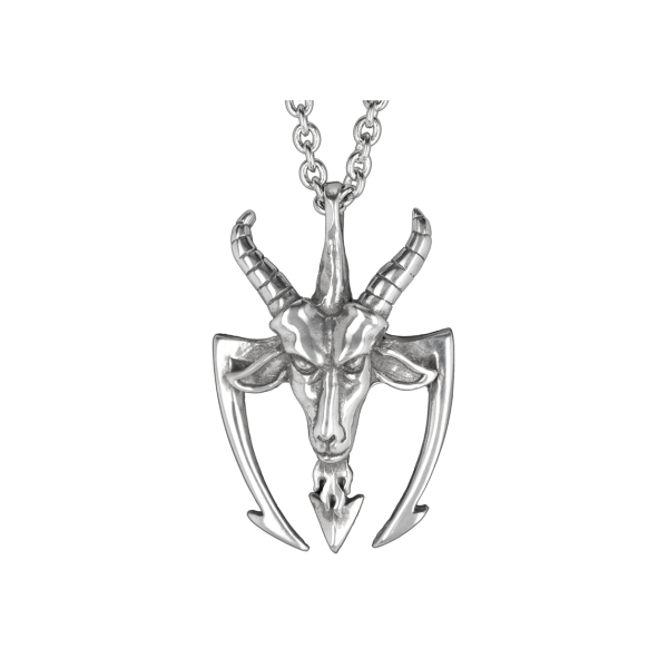 Tinnen hanger ramskop. Afmeting van de hanger ca. 26 x 40 mm. inclusief oog.