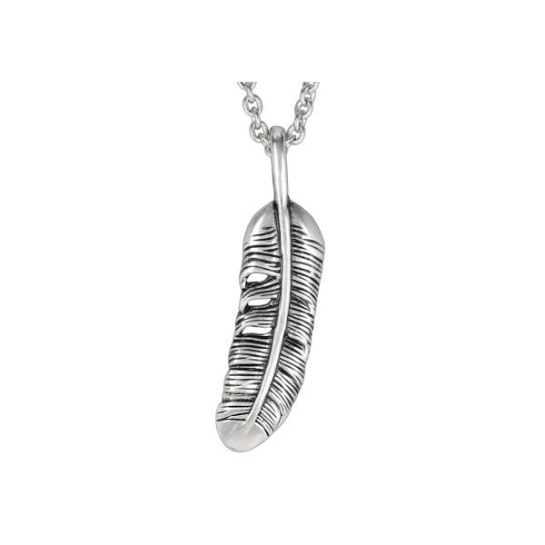Leuke hard tinnen hanger van een vogelveer. Afmeting van de hanger ca. 9 x 48 mm. inclusief oog.