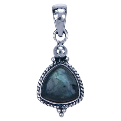 Zeer fraai bewerkte hanger met labradoriet steen. De hanger is vervaardigd van 925 Sterling zilver en is ca. 30 x 13 mm. groot incl. oogje.