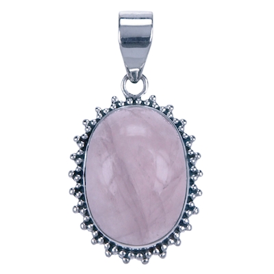 Mooie hanger met grote rozenkwarts steen. De hanger is vervaardigd van 925 Sterling zilver en heeft een prachtig kartelrandje. De afmeting van de hanger is ca. 30 x 17 mm. incl. oogje.