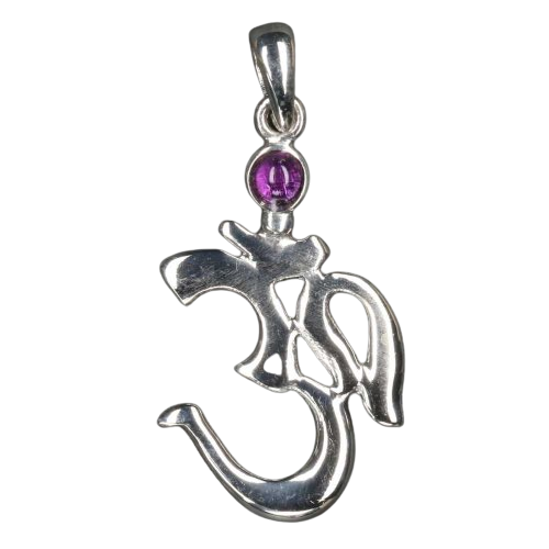 Hanger Ohm, vervaardigd van 925 Sterling zilver en bezet met een kleine amethist.
