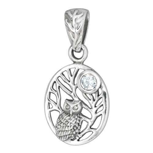 Prachtig bewerkte 925 Sterling zilveren hanger uil in een boom, versierd met een kleine zirkonia.