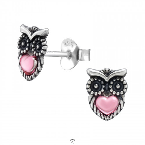 Prachtige oorstekers uiltje met roze kristalletje. De oorstekers zijn vervaardigd van 925 Sterling zilver en hebben zilveren stoppers. De afmeting van de oorstekers is ca. 6 x 8 mm.